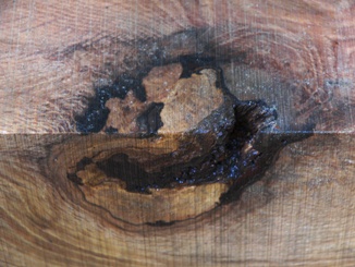 One more type of stain. If the frame is of douglas fir or larch or indeed any softwood it can be affected by bluestain fungus, which is harmless but covers the sapwood with lots of little blue spots. It mainly affects the sapwood (the lighter wood) and it fades with time when in a dry environment.