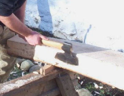 Historically it was not done with an adze (a common misconception), but with an axe, and