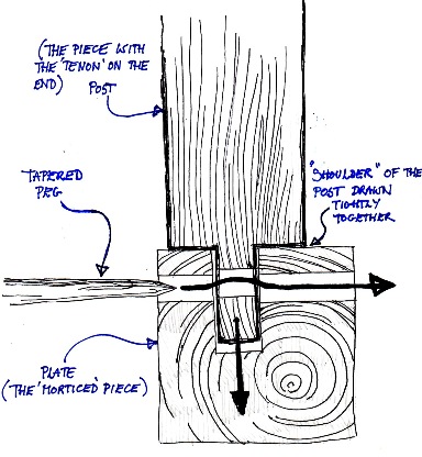Draw pegging: Another defining feature of green oak frames in this part of the world is that most of the joints are draw bored. The sketch to the right is of a section through a mortice and tenon joint (tenon- male part, mortice- female part), draw bored and pegged with a drawn or tapering peg (known as a garron in Scotland). Draw boring is simply the offsetting of the peg-hole in the tenon by a few millimetres in such a way that a tapered peg, when driven through, will draw the tenon further into the mortice thus tightening up the joint. In effect it acts as a wedge. This does not work so well with dowel or turned pegs.
