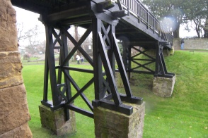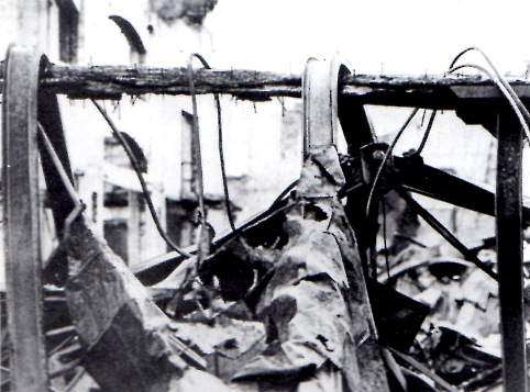 timber in a fire. The horizontal timber beam is still strong enough to support the collapsed steel girders which have been weakened by the heat of the fire.