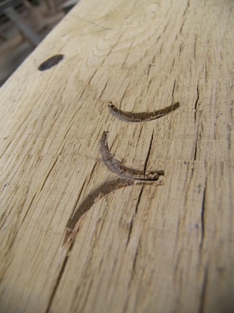 Normally a frame will have other marks scratched onto the timbers as well, such as 'plumb and level marks' which look like a long 'x' across the timber, or 'two foot marks' which look like an 's' bisected by a line. The reason they are scratched on is that, should the project be delayed at any point, they can not be washed off by the weather like a pencil mark. Thus the essential reference is preserved for use in later carpentry or on site during erection of the frame. Sand blasting usually obliterates these marks, but if the frame is not going to be sandblasted it may be necessary to consider this issue at an early stage. However most clients like them and the story they tell. After all these various frame markings are part and parcel of the tradition, and in conservation work often provide some of the biggest clues as to the history of a building. Normally my frames will be supplied with all these markings on the timber.